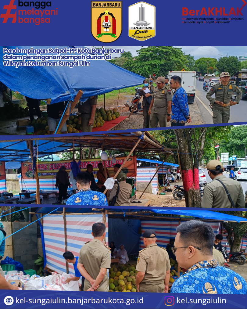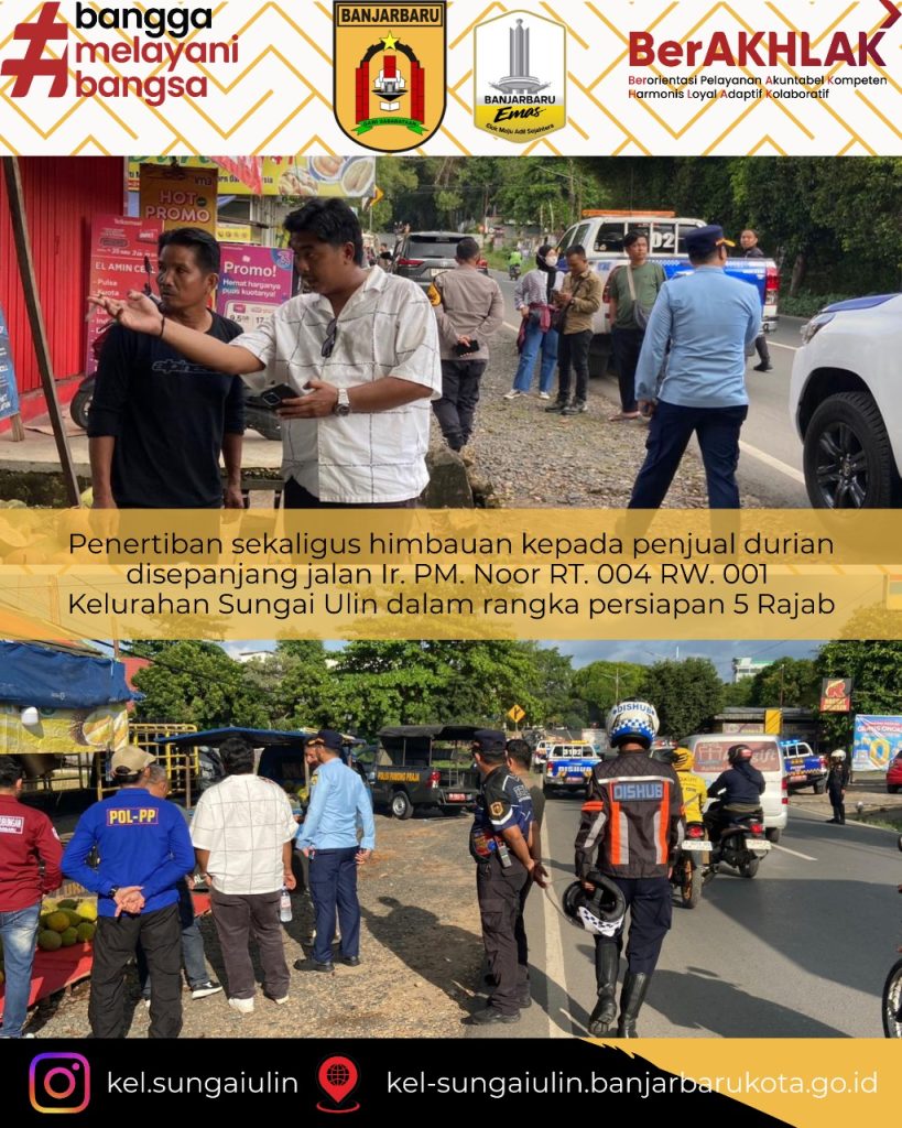 Kelurahan Sungai Ulin telah melaksanakan kegiatan penertiban dan himbauan kepada para penjual durian yang beraktivitas di sepanjang Jalan Ir. PM Noor RT 004/RW 001. Kegiatan ini dilaksanakan dalam rangka persiapan menyambut 5 Rajab serta menjaga ketertiban dan keselamatan pengguna jalan.