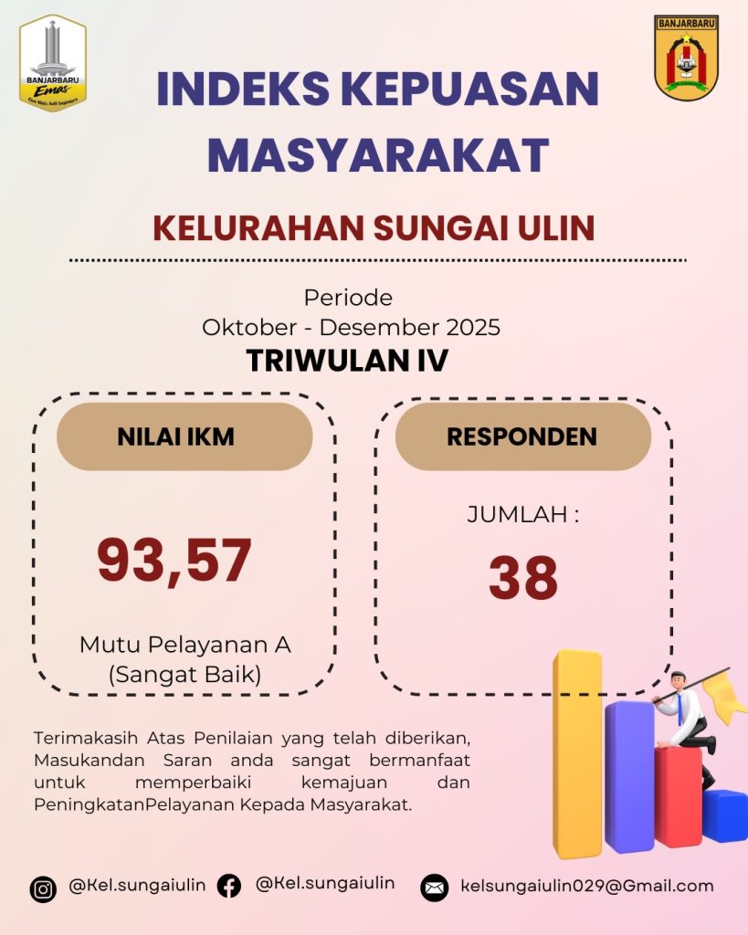 Sungai Ulin, Desember 2025 – Kelurahan Sungai Ulin kembali melaksanakan survei Indeks Kepuasan Masyarakat (IKM) sebagai bentuk evaluasi dan peningkatan kualitas pelayanan kepada masyarakat. Survei ini dilaksanakan pada periode Oktober hingga Desember 2025 dengan melibatkan 38 responden yang merupakan pengguna layanan di Kantor Kelurahan Sungai Ulin.