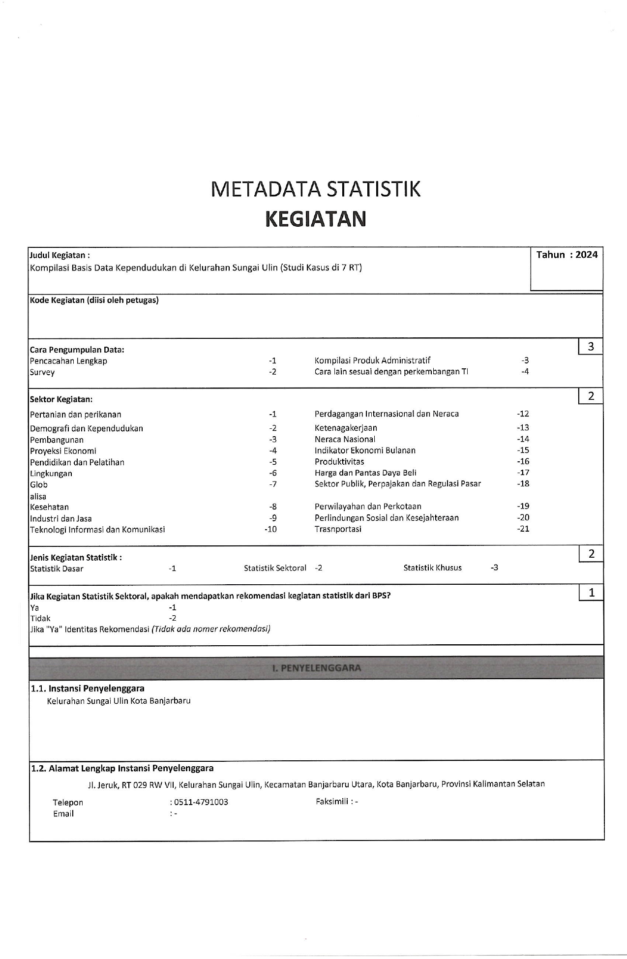 Metadata Kegiatan Statistik Kompilasi Basis Data Kependudukan Kelurahan Sungai Ulin